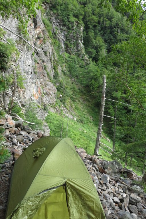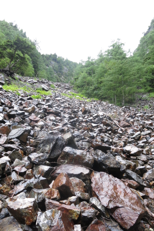 8/13(水)仙流荘前(臨時バス)5:40~6:35北沢峠~(バス)大平山荘6:45~7:50丹渓荘跡8:10~戸台川渡渉11:20~角兵衛沢登山口11:40~12:201合目12:30~13:50角兵衛沢岩小屋前~(上部偵察後)15:10幕営(2200m)