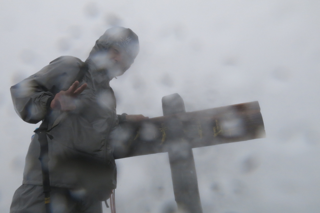 アサヨ峰へは、朝、青空が広がったためルンルン気分で出発。ところが樹林帯を抜けると殴りつけるような風雨となった。よろけるぐらいの風で、岩稜帯の通過は少し緊張を強いられた。