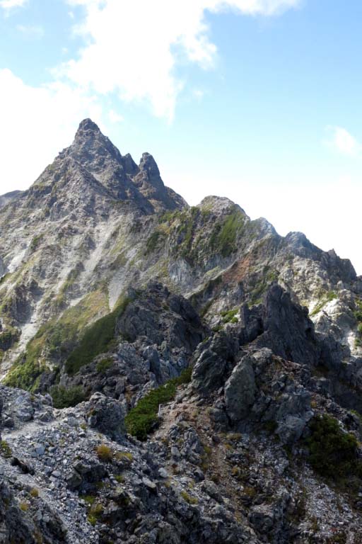 最後のピークP15。直登ルートを探していたら、おじさんが「こっちだよ」と自信をもって巻道を推奨していった。「本当かな~」。ケルンがあるから、行けないことはないはずだ。プリンは猛烈に直登を主張。おじさんが行った巻道を偵察に行くと、どうも方向が違う。引き返して、直登ルートを進むことにする。この巻道を進むと、槍の穂先の基部までまいてしまい、北鎌平も飛ばしてしまう。あとで彼らが、かなり下から登ってくるのが尾根から見えた。
