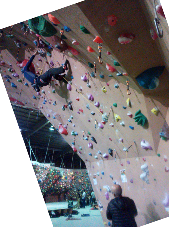 先生のビレイで5・11Aを登らせていただい。重力に逆らい天上に向かって登るのだが、そこでもダイアゴナルが有効なことが理解できた。それと腕は伸ばし、ぶら下がる感覚、足で突っ張り、腰が落ちないようにする-など、いろいろアドバイスをいただいた。