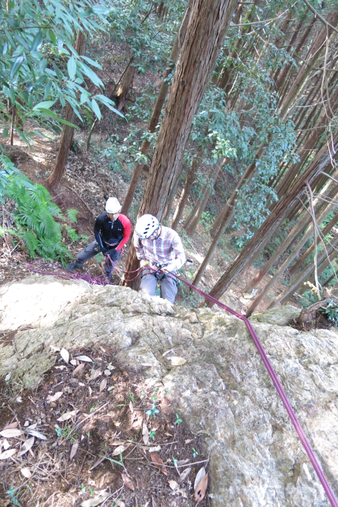 今回の山の会初級岩登り教室の課題は懸垂下降。日和田山の女岩南面で10月26日に実施。この日はバックアップなしのシンプルな下降技術から覚えてもらうこととしました。受講者から「こわかった~」という感想もあったけど、はじめてなので当然。ちょっとしたミスが重大事故に直結するのも事実。でも、しっかり正しい技術を覚え、実践すれば、大方のリスクは回避できます。そのうち快感になるかもね?!