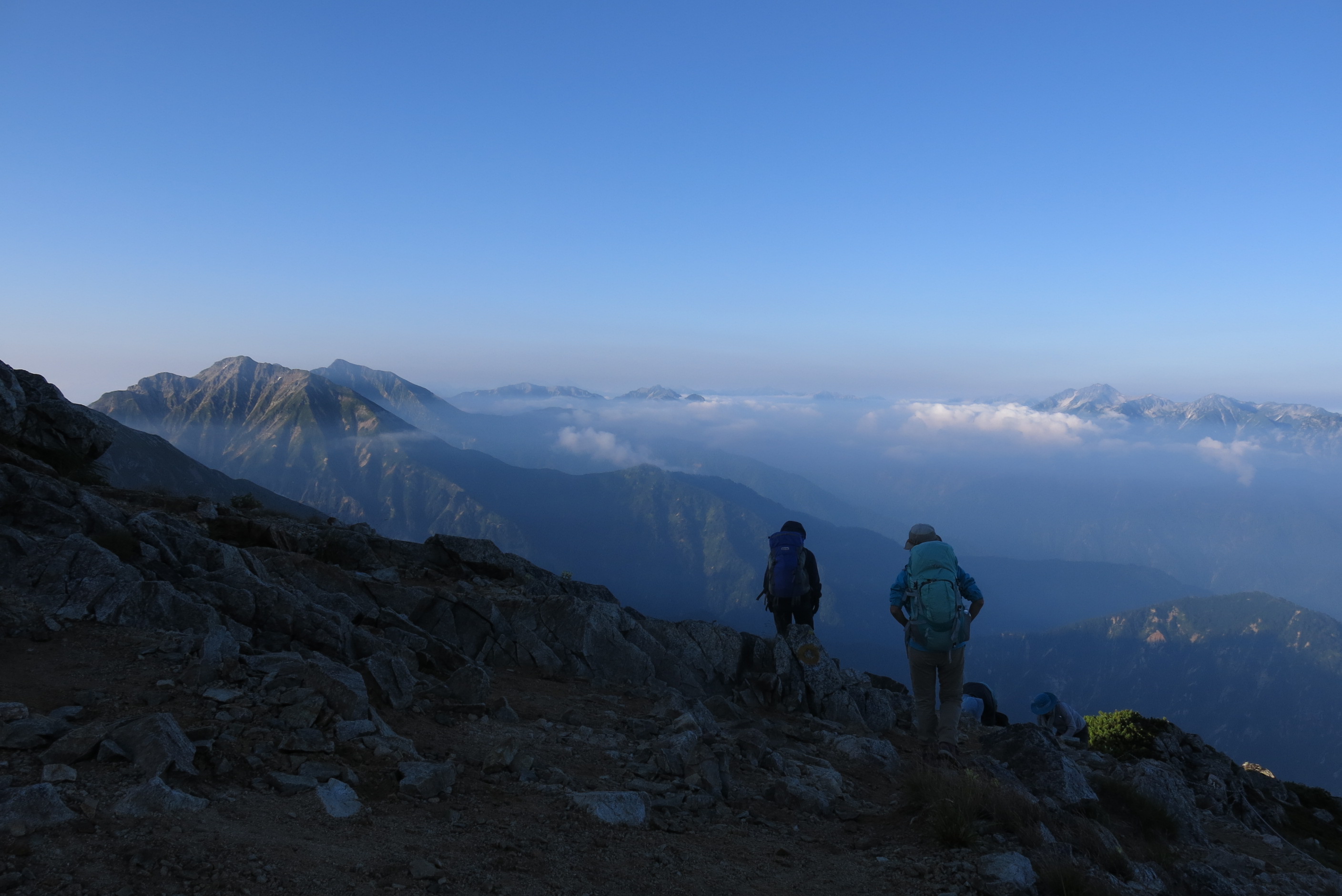 その不帰キレット。天狗の大下りから見下ろすと、綿あめのような薄雲が風に乗ってキレットを越していくさまは、例えようもなく美しい。朝日も当たって想像していたより明るい。昨年歩いた大キレットのような険悪さはない。ザレてはいるがさほど問題はなく、最低鞍部に到達した。前後に数パーティーしかおらず、落石のリスクが少なかったのもよかった。その後も、いくつかの鎖場通過で少し待たされたくらいで問題なし。有名な空中梯子も写真で見るよりはるかに短く、拍子抜けするぐらい。2峰にくれば、ほぼ核心部も終わる。それまで抜きつ抜かれつしていた山慣れていそうな30代と思しきカップルが、我々がポーズをとって写真を撮ったりしているのを見て、「余裕あるね。写真なんか1枚も撮れなかった」「こういうところ慣れてるんだよ」と、ひそひそと話しておりました。