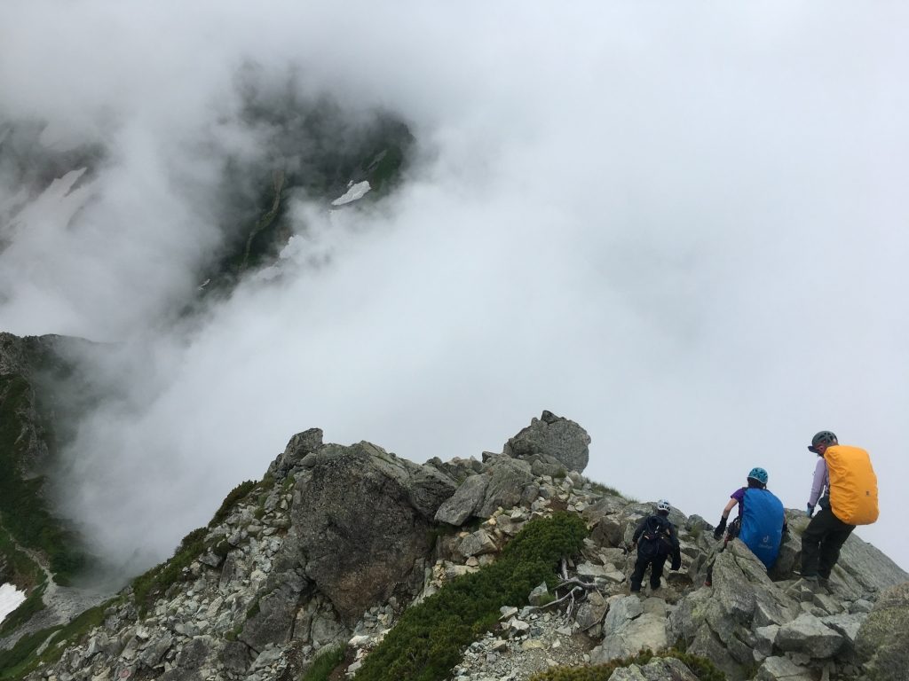ハイマツを掴んで、じっと我慢の登りが続く。そしてやっとハイマツ帯が切れると、高度感抜群の岩稜帯の登りとなる。予報に反して青空が広がり、じりじりと日に焼けるのが分かる。岩稜帯はフリクションも良く効き、手がかり足がかりも豊富。気持ちよく高度をかせげたが、ガレ場では落石を起こさないよう細心の注意が必要となる。眼下には平蔵谷の雪渓から水蒸気がゆらゆらと立ち上がり、涌いてきた薄雲が混ざり合い、幻想的な景色をつくり出す。