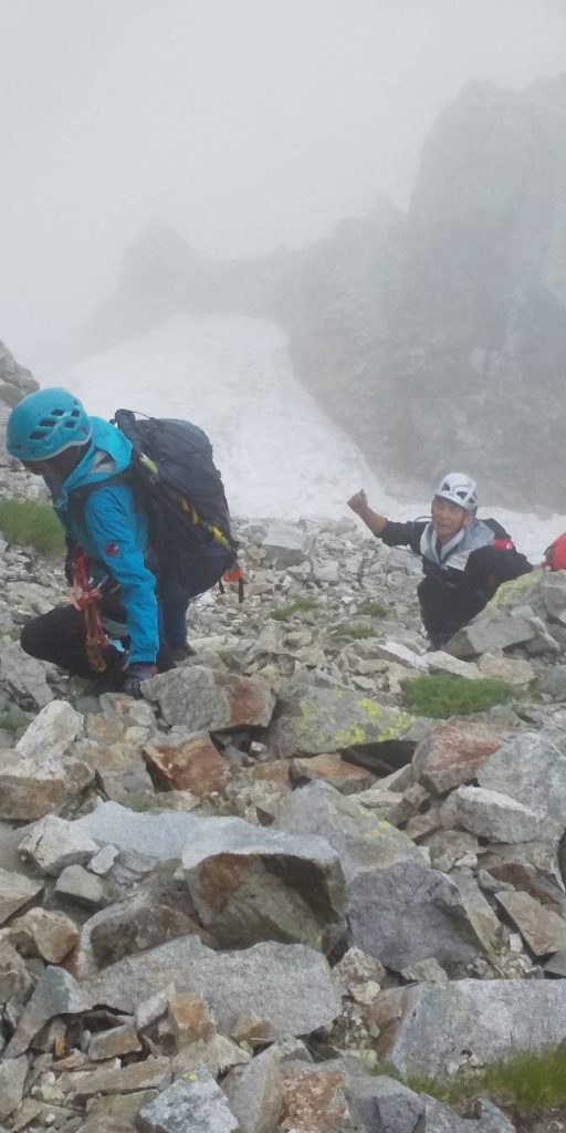 先行パーティーとは、2峰で懸垂下降の準備中に追いついた。支点は残置のスリングがきれいに取り除かれ、直径3㎝ぐらいの鉄棒の支柱に極太の鎖が何重かに取り付けられ、さらに近くの岩にセットした10㍉ロープでバックアップが取られていた。先行パーティーのリーダーは50㍍のダブルロープを2本結束し、トップで下降。着地点に雪渓があるかどうか、我々の50㍍ロープ一本で足りるかどうかを、確認してくれることに。結果は雪渓なし、50㍍ロープ1本では不安ありとして、先行パーティーのロープを使わせていただくことに。またまた深謝!!