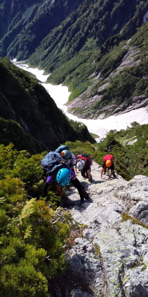 先行パーティーのリーダーが、ハーケンにスリングをセットしていても、後続2人が難儀するほど一手目がちょっと悪い。そのセットを我々のために残してくれたのだ。そのおかげで短時間で突破できた。クライミング要素が必要な次の箇所でもセットした支点を気持ちよく貸していただき、我々はロープを出して、ここもスムーズに突破できた。感謝しかない。