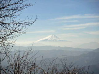 見慣れた避難小屋に着きガラス越に中を覗くと、数枚の毛布等が用意され綺麗に片付いていた。ここで地図を開き下山路を確認し、更に念のため標識を見に少し下りチェックし山頂へと向かう時、先ほど追い抜いた鈴の登山者が前をゆっくりと登って行くのが見えた。山頂には奥多摩湖より上がって来たと言う単独者と鈴の人の二人だけだった。広い山頂の北面より石尾根その奥に長沢背稜、南面からは大山、三峰、丹沢の山並が、木の葉が生い茂る時期と異なりこの時期眺望が素晴らしい。達成感に浸り昼食後惣岳方面に少し足を延ばし裾野までの富士を見、山頂を後に鞘口、大ダワへの登山道に進もうとしたら!