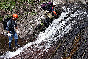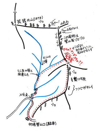 地形図で緩やかな地形を確認しつつ方向を見定めていたつもりだったが二俣を早めに勘違いしてしまいアレヨアレヨという間に登山者がゾロゾロ歩くりっぱな登山道の尾根上に上がってしまった。行きかうハイカーはヘルメットとハーネスで固めた我々の姿を不思議そうに見ながら通り過ぎる「あんたらそんな格好で何してんの??」さもそう言いたげなまなざしを感じつつ、いったい自分がいま何処にいるのか見当がつかなかった。こんなに大勢のハイカーのまっただ中で自分の居場所が分からない…まるで遊園地の人混みの中で迷子になったような気分だった。