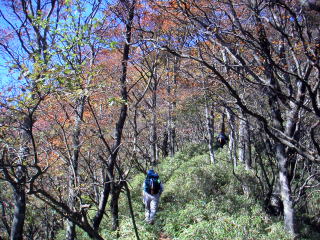 未だ明けぬ夜空に無数の星が輝く中、石神井公園北口へと良き山行を期待し向かった。2号さん運転の車は中央道の相模湖インターで下車し、青根を通過し神ノ川ヒュッテの在る登山口に到着した。この地より大室山への昭文社の地図を見ると破線(難路)になっていた。入山して直ぐに沢があり飛び越す事が出来ない!渡れそうな場所を探し無事登山道へ。先が思いやられたが行く手には赤テープや布切れが木々に巻かれ登山道もしっかりしていた。沢沿いのガレ場やルンゼを幾度か通過し急登で尾根に向かう。頭上は雲一つ無い紺碧の空に色付き始めた自然林が映え美しい!たわわに実を付けたナナカマドが更に色を添えていた。