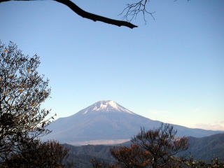 尾根上に出ると、遠くに南アルプスの山並、眼前にうっすらと雪を被った富士、相模湾の真鶴半島先には初島。大島、利島までも眺望出来る!2号さんが所属している、会の新人(25才)さんが振り返り筑波山が見えると!好天の中、木々を見上げ実を摘み倒木に生える茸を調べ、皆自然林の中を陶酔しながら歩く。予定は大室山から犬越路経由で下山だったのが、到着した大室山頂でリーダーの2号さんより時間が或るので加入道山まで足を進めようと言われ、私は心の中でヤッターと叫んだ。この大室山は中央道を走っている時に富士の前に重なる様に聳えていた山だったが・・・山頂は平らな尾根上の様な場所だった。予定変更し更に進むことになったが先に山が無い?行く先は下るばかり、やっと右方向の視野に入った山が加入道山だった。