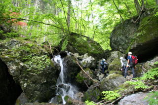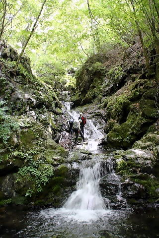 ほとんど直登可能な小さな滝が続き、かわいらしいナメ滝もある。何より、今回の最大の収穫は、新緑だった。沢から見上げると、陽光に透けた若葉が輝いていた。