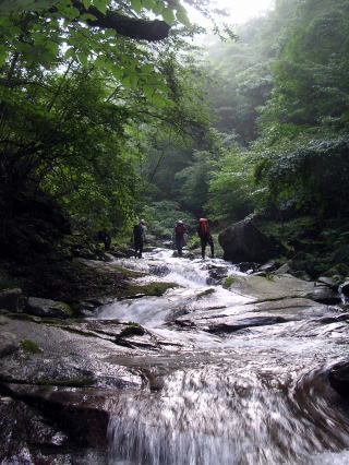 ヒロナガ(CL)にご〜。テンプル、ケムタク、プリン 言い出しっぺのヒロナガがリーダーということで、急遽ヌク沢左俣でまとまった。何といっても大滝260bが売りのヌク沢で、これまで行ったところにはないスケールに胸が高鳴る。 【30日】 夜10時に練馬駅に集合。にご〜。カーで一路、西沢渓谷を目指す。思ったより早く2時間で「道の駅」に到着。軽く一杯やって就寝。ここには天井もあるので快適に眠れる。 【31日】 道の駅を5時に出る。快晴である。西沢渓谷入口の無料駐車場に車をとめ出発。近丸新道に入り、一時間近く登って堰堤前から入渓。でかい堰堤を越えるとナメの回廊が待っていた。奥秩父らしいたたずまいに感激。が、その後の堰堤の連続越えには、知っていたものの興ざめである。最後の堰堤を左から越えた後からは、奥秩父らしい明るいナメの連瀑帯で、楽しい沢登りができた。やはり圧巻は、260bの大滝。その直前の滝も美しいので、堰堤の興ざめは、帳消しになった。