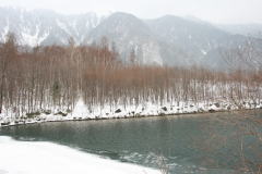 大正池の冬景色釜トンネルからは長い林道歩きが続く【30日】小屋にむりむりテント山より早い午後6時に就寝して、午前2時半車にて我が家を出発。順調に目的地に到着した。釜トンネル入口の長野県警登山指導所で計画書を提出。前日戻ってきたパーティーは全部敗退といわれちょっと不安になった。入れ違いに入った組が、きょうどこまで登っているかで我々の結果も決まりそうだ。初めて歩く釜トンネルの中は、凍結もなく快適に歩くことができた。 トンネルを抜けると、いよいよ銀世界。だが、雪は想像してたより少なく、これまで年越し山行で毎年訪れている南アと変わりがないようだ。一泊目の宿泊地、横尾の避難小屋までは約7時間と長かった。小屋の前には水か引かれ、凍結はなかったので助かった。小屋のすぐ横のトイレも使えてグッド。小屋の中に入ると、すでにテントを張った二人組を含め数パーティーの先客がいたが、まだ余裕あり。暗いけど角の部分にスペースを確保した。その後、到着した夫婦2人パーティー(世代は我々と同じか?)には、ちょっとびっくり。わずかのすき間にテントを無理矢理張ってしまった。すいているならともかく、別に張らなくても快適なのにと横目で見ていたが、初めて目にする光景に少々驚いてしまった。驚きついでにもう一つ。午後4時頃に、我々以外は寝る体制に入ってしまったのだ。「まだ寝るなよ」ともいえず、2人で静かに酒盛りをして頑張ったが、6時ごろにはおつきあいで寝袋に入った。ラジオで紅白の合間に天気予報を聞くと、長野の中北部は晴天とのこと。「やった」と胸のなかでガッツポーズをとって就寝した。 トレースに感謝!鉄扉にご注意!