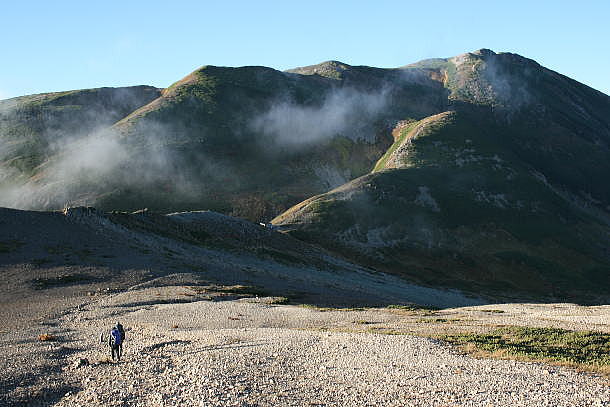 綺麗な山だな。雪倉岳の第一印象だった。谷間から湧く雲を薄衣のようにまとう姿に、しばし見とれたのを今も憶えている。白馬岳の頂上宿舎で汲んだ水の重さで、ずしりと肩に食い込むザックを恨みながらも、長い1日がやっと終わろうとしていた頃だった。量感豊かな山容となめらかな山肌、あの雪倉岳の頂に向かう尾根の始まりに、きょうの宿、雪倉避難小屋が見える。一刻も早く重いザックから解放されたいが、この山をもう少し眺めてもいたい。そんな小さな葛藤があった。遅い足取りに、我々の影法師が見る見る伸びていくー。くたびれ果てながらも栂海新道を歩き通し、日本海の水に戯れた充実の日々。雪倉岳の姿とともに鮮烈に蘇る。(北アルプス・雪倉岳 2007/10/06)