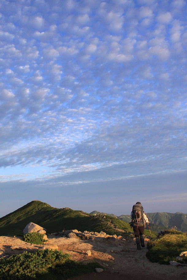 くるくる変わる天候に翻弄された。出だしは大嵐で計画より手前の門内小屋に足止めされた。翌朝、弱まった風雨の中、消えない不安を抱えたまま出発した。時間がたつと山肌にまとわりつく雲がはぎ取られ、時折青空さえのぞかせるようになった。そしてフィナーレ。低く垂れ込めた鱗雲が天空を飾り、黄金色の大気が我々を包み込んで送り出してくれた。楽しい下り道とはけっして言えない大ー(だいぐら)尾根に入るまでのわずかな時間ではあったが。(2009年8月15日