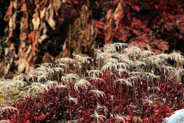 夏の高山に咲くチングルマ。花は純白で可憐だ。花が終わると風車のような形をした綿毛に変身。まるで真っ赤な絨毯の上を舞う秋の妖精たちのようだ。