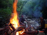 【17日】午前8時頃に会事務所前をにご〜。カーで出発。連休中日のせいか、渋滞にもあわず午前11時半前には深山ダム奥のゲートに到着。残念ながらしっかりと鎖が張られ、ここから三斗小屋宿跡まで歩く。林道をとぼとぼ歩き45分ほどでキャンプ予定地に到着。さっそく焚き火の準備にかかる。あとはやることがないので、缶チュウーハイなどを飲みながら夜を待つが、待ちきれずに明るいうちから、焚き火に点火。たっぷり焚き火に酔いしれた。 【18日】 6時ちょうどに入渓する。本流にかかる橋を過ぎて、すぐ左が井戸沢だ。入渓点は涸れていて冴えないが、10分もすると水流が現れ、20分ほどで最初の滝が迎えてくれる。ここは左から越える。小さな滝を越え30分で20b滝が現れる。水量も多く、けっこうな迫力。直登はちょっと厳しい。左岸に古い虎ロープが垂れ下がっている。ロープを出し、にご〜。がトップで登る。プリンがプルージックで続き、しんがりがヒロナガ。詰めたところがハングっぽくなっていて、最後の二手ぐらいが踏ん張りどころ。残置ハーケンににゅるっとしたテープシュリンゲがぶら下がっている。この先は笹藪で、踏み跡を進むと滝の落ち口にすんなり到着。ロープを出したのは、結局ここだけだった。