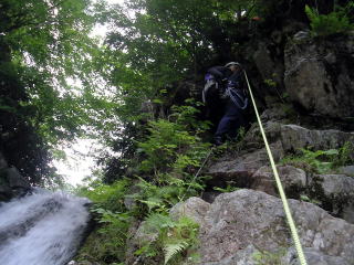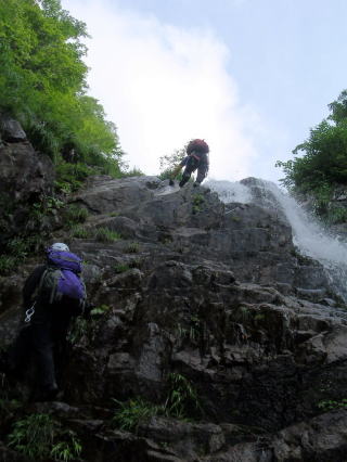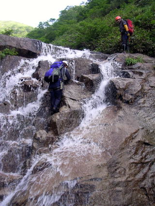 雪が多いせいなのか、ずーっとナメ状。段々状の滝を気持ちよく越え高度をかせぐ。10b滝は水流のど真ん中をシャワーを浴びながら越える。気持ちよかー。ここまでくると、いよいよ源流域という感が強くなる。花に彩られた緑の中を、天に向かって一筋の道が続く。これぞ天国系!
