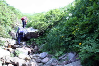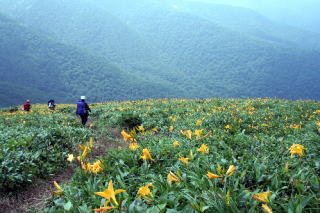 登山道に出て流石山に向かうと、さらにビックリ。これまで見たニッコウキスゲの群落の比ではない、見渡す限りニッコウキスゲで、黄色に染まっているのだ。これに見とれながら登山道を歩いていると、三斗小屋方向からぞろぞろと登ってきたハイカーたちから、興味津々の視線を浴びた。それもそのはず、ヘルメットをかぶり、熊よけの鈴代わりにがちゃがちゃ鳴るカラビナやらエイト環、にご〜。の腰にはトンカチまでがぶら下がっているのだから、「いったい何者ぞ」と怪しまれるのも当たり前かも。