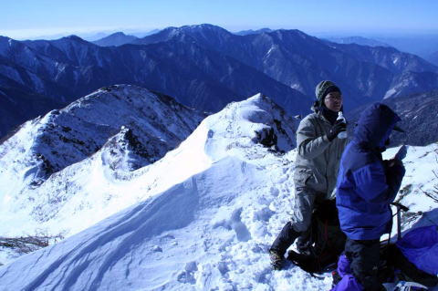 最後の急登に入っても、この状況はまったく変わらず、汗をかきかき牛歩で登った。テン場を出て3時間弱、頂上を踏んだ。そこは、まさに360度の大パノラマ、遮るものは何一つない。ちぎれた雲辺ひとつないのだ。すべてが、ブルーに染まっている。「この時季に、こんなことってあるんだ」と、心の底から底から嬉しさが込みあげてきた。奇跡に近い好天を与えてくれた山の神に感謝!である。