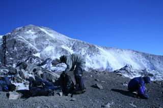 予定通り、午後3時少し前に「携帯可」の標識がある場所に到着した。さっそくタクシー会社に電話し、明日の予約をお願いした。下も降雪はなかったので、まったく問題なしだ。 ケムタクが担ぎ上げた、おせちで乾杯!だがアルコール類が残り少なく、ちょっと寂しい。が、きょう一日の我慢です。 1日 快晴06年の最初の朝が明けた。きょうも快晴のようだ。きっとあの親子も、素晴らしい頂上を踏むことだろう。お雑煮の朝食を済ませ、テントをたたみ、最後のビバーグ地を後にした。