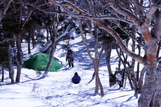 ここから、西沢渡までは、ほとんど傾斜のない林道を落ち葉を踏みしめながら歩く。40分ほどで、西沢渡に着いた。渡渉は数b下の沢をわたらなければならない。流れは少ないとはいえ、石の上に雪がかぶっているので滑りそうだ。が、ここには荷物を渡すための手動式ゴンドラ?がかかっていて、ロープを引っ張ることで空中を移動することができる。造りは、しっかりしていて、まだ新しい。 対岸には、すでに4人パーティーが幕営していたが、我々は少しでも高度を稼ぐことにして、沢の水を汲んでから急登にとりついた。40分ほどで、テント一張り分のスペースを見つけて幕営し、前夜祭と称して一杯やってから寝袋に潜り込んだ。 30日 曇りのち雪ここからは急登の樹林帯をひたすら登るのみ。「きょうは調子がいい」と高度をどんどん稼いでいたのだが、1700bを越えたぐらいから突然、高度障害が出てしまった。呼吸を速めてもさっぱり空気を吸っている気がしないし、足に力も入らない。朝、出るときは、九州から太平洋側を進んでくる低気圧の影響を考えて、時間が許せば、きょうのうちに登頂してしまおうと打ち合わせていたのだが…。高度を上げるにつれ雪が舞いだし、森林限界より上は強風が吹き荒れ始めたようだ。猛烈に発達した日本海側の低気圧の影響と思われる。これでは、無理して登頂する意味はないし、私の体調からしても、きょうの登頂はなしにすることにした。もうすぐ、聖平への分岐というところで、頂上から降りてきた単独登山者とすれ違った。風はないもののラッセルが大変だったという。上には、あと4人パーティーがいるらしい。