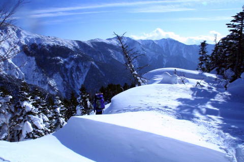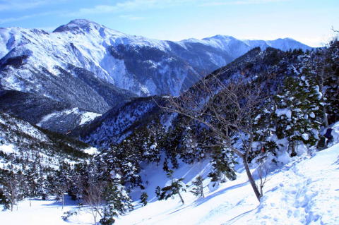 聖平小屋が右眼下に見えるところまで到達したが、薊畑の分岐がよく判らないし、トレースもないのでそのまま前進した。スノーシューを履いた4人組が降りてきた。単独男性がいっていたパーティーだ。「上は風速20bはある」という。ただ、最後の樹林帯ならビバーグは可能とのこと。それを信じて、聖平には下らず、トレースを頼りにもう少し先に進むことにした。