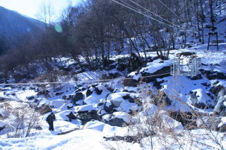29日 快晴朝一番の高速バスで新宿を発ち、予定通り午前11時にJR飯田駅に到着。予約しておいた天竜観光タクシーに乗り込んだ。「4駆車はこれしかない」ということで、10人以上は乗れるワンボックスカー(少々年期物)で快適ドライブとなった。途中、対向車が接触寸前で急ハンドルを切って脱輪してしまい、救出に時間をくうというアクシデントはあったものの、上村上町の小野尾集落までは問題なし。その先は出たとこ勝負「行けるとこまで」という約束で、もし積雪で入れなければ3時間の林道歩き、祈るような気持ちで車窓を見つめていた。小野尾集落を過ぎると、やはり積雪も多くなったが、轍もあって何とか行けそうだ。上村上町は飯田市と合併したばかりなのだが、それまではきめ細かな除雪がされていたものが、「節目しかやってくれなくなった」と、ドライバーが嘆いていた。実は、これと同じ嘆きを、昨年、鳳凰三山に行くために夜叉神峠に入るときにもタクシードライバーから聞いた。ここでは芦安村などが合併して南アルプス市になったのだ。このときのドライバーは、「合併でいいことは一つもない」と、怒っていた。