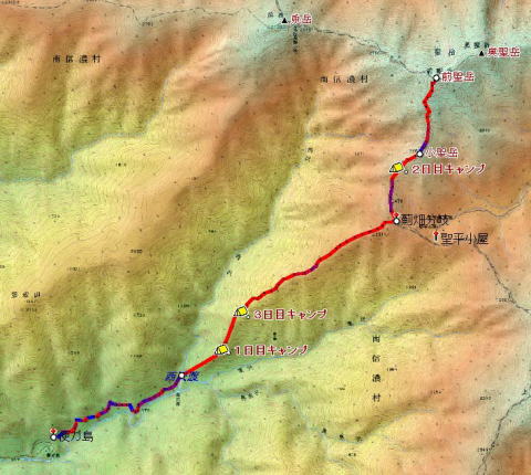 飯田駅近くの旅館・三宜亭に運んでもらい、温泉で汗を流す。高速バスの発車まで、どこかで一杯と店を探したが、さすがに元旦は営業していない。仕方がないので、コンビニでつまみや酒類を仕入れて、バスの待合室で静かに打ち上げをやった。それぞれが登頂成功の喜びをかみしめた。 【コースタイム】