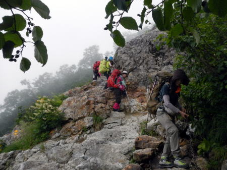| 2日目の出だしもしばらくは雨模様。カッパを着て大雪渓を登る=8月2日 |