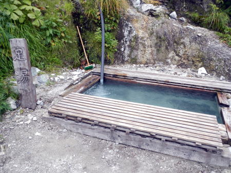| 鑓温泉の足湯。せめて足湯だけと思ったが、到着が遅れるのでパスした=8月3日 |