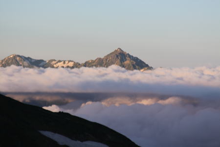 | 3日目の朝、やっと晴れ。雲海の上に剱岳が顔を出す=8月3日 |
