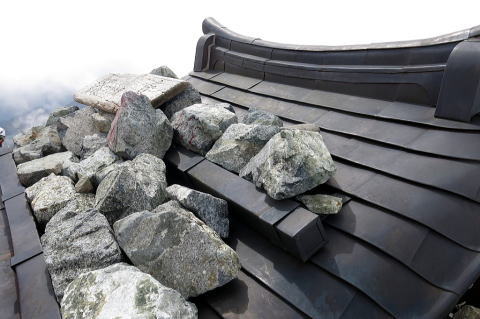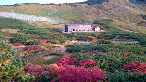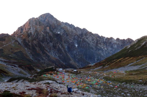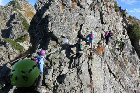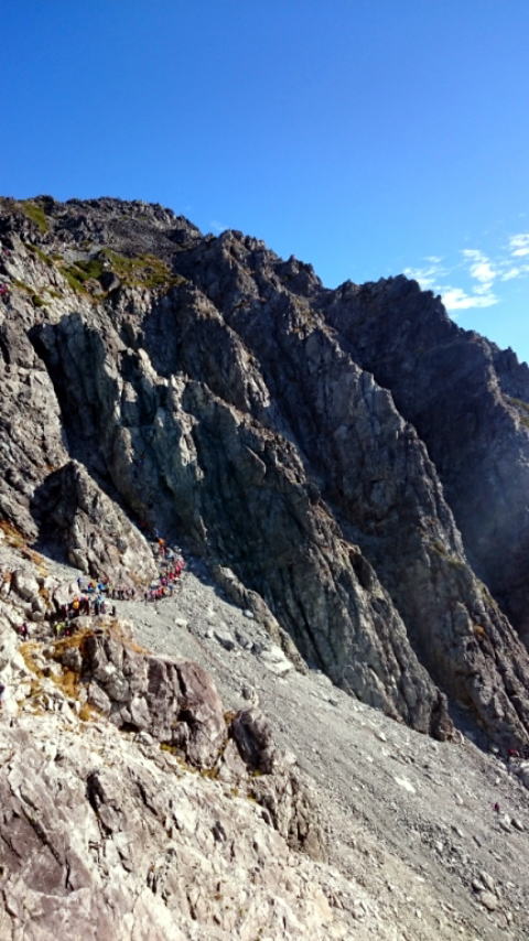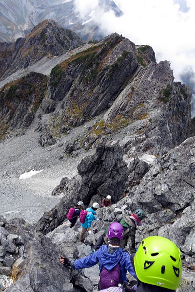 | そいつは突然に現れた。雲の衣をまとい、黒々とした岩肌を飾っていた。威風堂々という言葉が実に合う。うかつには近づけない、圧のようなものを感じさせる孤高の山だ。ところがカニのたてばいには、話題のラーメン屋の前にできる都会のありふれた風景よろしく、長い行列ができていたのだ。その行列と少し違うのは、ほとんどの人が頭にヘルメットをのせていたことだ。ガリバーに群がるこびとのようで、ユーモラスさえ覚えてしまい、緊張感はいっきにとろけてしまった。しかし、よく考えると険しさは一級の山だという事実は、登る人の多さに関わりなく厳然としてあるのだ。いや、むしろ人の多さ故に落石や落人のリスクは高まる。改めて気を引き締めた。 |