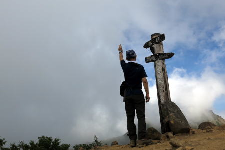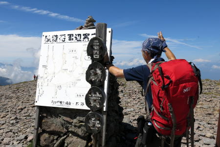 | お約束の後ろ姿。いわゆる証拠写真です。背負い方がいまいち=8月17日、硫黄岳頂上 |