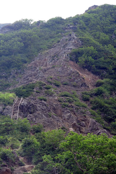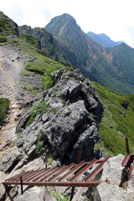 | 阿弥陀岳への登り。頂上まで岩場がずっと続きます=8月17日 |